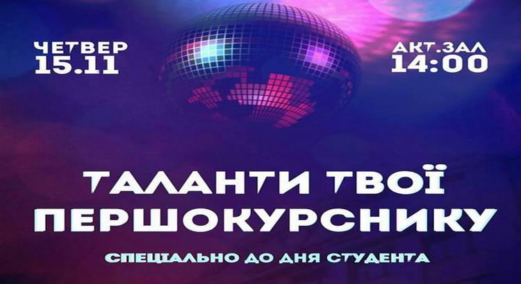 У нашому інституті здавна є традиція – випробовувати першокурсників на міцність. Тому, якщо ти хочеш гарно провести час та повеселитися – запрошуємо 15 листопада о 14:00 годині на святковий концерт «Таланти першокурсника» з нагоди Дня студента.
